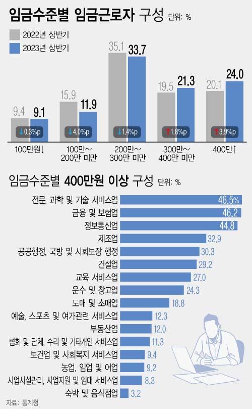 ¿ÃÇØ »ó¹Ý±â Á÷ÀåÀÎÀÇ 55%°¡ ¼¼Àü ¿ù±ÞÀÌ 300¸¸¿ø ¹Ì¸¸ÀÎ °ÍÀ¸·Î ³ªÅ¸³µ´Ù. 4¸í Áß 1¸íÀº ¿ù±ÞÀÌ 400¸¸¿ø ÀÌ»óÀ̾ú´Âµ¥, °úÇбâ¼ú¼ºñ½º¾÷¿Í ±ÝÀ¶º¸Çè¾÷¿¡¼ ±× ºñÁßÀÌ ÄÇ´Ù. Åë°èûÀº 17ÀÏ ÀÌ·± ³»¿ëÀ» ´ãÀº ¡®2023³â »ó¹Ý±â(4¿ù) Áö¿ªº°°í¿ëÁ¶»ç Ãë¾÷ÀÚÀÇ »ê¾÷ ¹× Á÷¾÷º° Ư¼º¡¯À» ¹ßÇ¥Çß´Ù. Áö¿ªº°°í¿ëÁ¶»ç´Â µî·Ï¼¾¼½º¿¡ ±â¹ÝÇÑ Àα¸Ãß°è °á°ú¸¦ ¹ÙÅÁÀ¸·Î Áý°èÇϸç, ÀÀ´äÀڵ鿡°Ô Áö³ 3°³¿ù°£ ¼º°ú±Þ µîÀ» Æ÷ÇÔÇÑ ¼¼Àü Æò±Õ ÀÓ±Ý µîÀ» Á¶»çÇØ °øÇ¥ÇÑ´Ù.