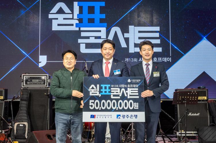 ÀÌ ÀÚ¸®¿¡¼ »ç¶ûÀÇ È£ÇÁµ¥ÀÌ Çà»ç¸¦ ÁÖÃÖÇÑ ±¤ÁÖÀºÇà ³ëµ¿Á¶ÇÕ°ú ±¤ÁÖÀºÇàÀº Àü Á÷¿øµéÀÌ Èñ¸ÁÀ» ³ª´©°íÀÚ ¸ð±ÝÇÑ 5000¸¸¿øÀ» ±èÁø°ï ±¤ÁÖ»çȸº¹Áö°øµ¿¸ð±Ýȸ »ç¹«Ã³Àå¿¡°Ô Àü´ÞÇß´Ù.