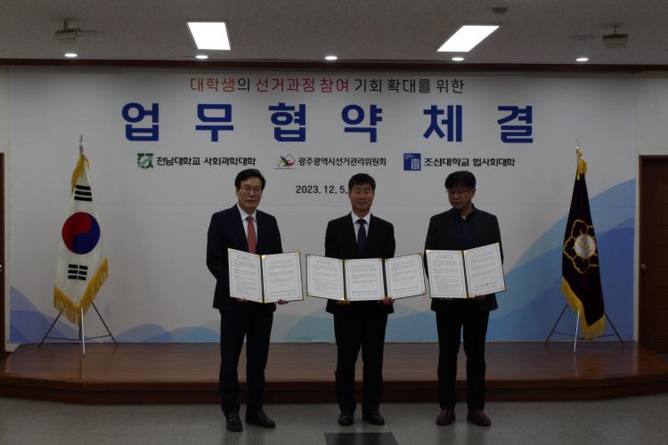 ±¤Áֽà ¼±°Å°ü¸®À§¿øÈ¸°¡ 5ÀÏ Àü³²´ë »çȸ°úÇдëÇÐ, Á¶¼±´ë ¹ý»çȸ´ëÇаú ´ëÇлýÀÇ ¼±°Å °úÁ¤ Âü¿© ±âȸ È®´ë¸¦ À§ÇÑ ¾÷¹«Çù¾àÀ» ü°áÇß´Ù.
