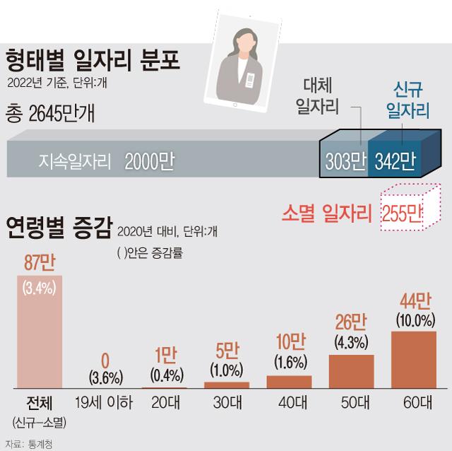 Áö³ÇØ ÀÏÀÚ¸® ¼ö°¡ 1³â Àüº¸´Ù 87¸¸°³ ´Ã¾úÁö¸¸ ÀÌ °¡¿îµ¥ 51%´Â 60¼¼ ÀÌ»óÀÌ Á¡À¯ÇÑ ÀÏÀÚ¸®ÀÎ °ÍÀ¸·Î Áý°èµÆ´Ù. °æÁ¦ÀÇ Ç㸮ÀÎ 30´ë´Â 5¸¸°³, 20´ë´Â 1¸¸°³¿¡ ºÒ°úÇß´Ù. 6ÀÏ Åë°èûÀÌ ¹ßÇ¥ÇÑ ¡®2022³â ÀÏÀÚ¸®ÇàÁ¤Åë°è¡¯¿¡ µû¸£¸é Áö³ÇØ ¿¬°£ ÀÏÀÚ¸®´Â 2645¸¸°³·Î 1³â Àüº¸´Ù 87¸¸°³(3.4%) ´Ã¾ú´Ù.