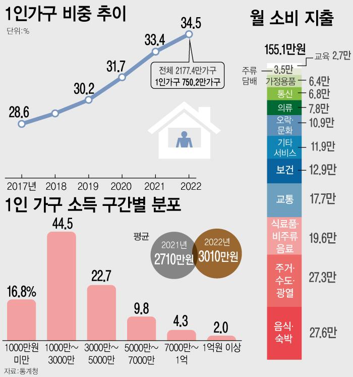 Åë°èûÀÌ 12ÀÏ ¹ßÇ¥ÇÑ ¡®2023 Åë°Ô·Î º¸´Â 1ÀÎ °¡±¸¡¯¿¡ µû¸£¸é Áö³ÇØ 1ÀÎ °¡±¸´Â Àüü °¡±¸ÀÇ 34.5%ÀÎ 750¸¸2000°¡±¸·Î Áý°èµÆ´Ù. 1ÀÎ °¡±¸ÀÇ ºñÁßÀº Àü³âº¸´Ù 1.0%Æ÷ÀÎÆ®(p) ´Ã¾ú°í, °¡±¸ Áß ¿©ÀüÈ÷ °¡Àå Å« ºñÁßÀ» Â÷ÁöÇß´Ù.