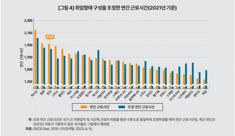 ºÐ¼®¿¡ ´ë»óÀÌ µÈ OECD 30°³±¹ÀÇ ±âÁ¸ 1ÀÎ´ç ¿¬°£ ±Ù·Î½Ã°£Àº 1646½Ã°£À¸·Î ¿ì¸®³ª¶óÀÇ ¿¬°£ ±Ù·Î½Ã°£ÀÎ 1910½Ã°£°ú 264½Ã°£ÀÇ °ÝÂ÷°¡ Á¸ÀçÇß´Ù. Ãë¾÷ÇüÅ ±¸¼ºÀ» Á¶Á¤ÇÑ ÈÄ¿¡´Â ¿ì¸®³ª¶ó 1829½Ã°£, OECD 30°³±¹ Æò±Õ 1648½Ã°£À¸·Î Áý°èµÆ´Ù. ±Ù·Î½Ã°£ °ÝÂ÷´Â 181½Ã°£À¸·Î ¾à 31% °¨¼ÒÇß´Ù.