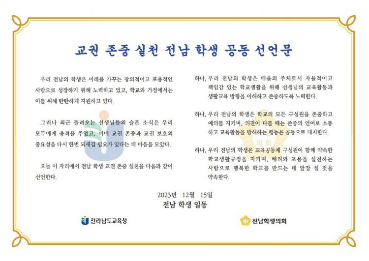 ¡®Àü³²Çлý Àϵ¿¡¯ ¸íÀÇ·Î ¹ßÇ¥µÈ ¼±¾ð¹®Àº ±³±Ç Á¸Áß°ú º¸È£¿¡ ´ëÇÑ ÇлýµéÀÇ ½ÇõÀÇÁö°¡ ´ã°å´Ù.