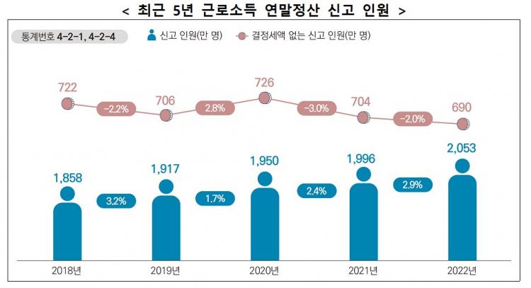 20ÀÏ ±¹¼¼Ã» ±¹¼¼µ¥ÀÌÅÍ Åë°è¿¡ µû¸£¸é 2022³â ±Í¼Ó ±Ù·Î¼Òµæ ¿¬¸»Á¤»ê ½Å°í ÀοøÀº 2053¸¸¸íÀ¸·Î 5³â Àü(1858¸¸¸í) ´ëºñ 195¸¸¸í(10.5%) Áõ°¡ÇßÀ¸¸ç, °áÁ¤¼¼¾×ÀÌ ¾ø´Â ½Å°í ÀοøÀº 690¸¸¸íÀ¸·Î 5³â Àü(722¸¸¸í) ´ëºñ 32¸¸¸í(4.4%) °¨¼ÒÇß´Ù.