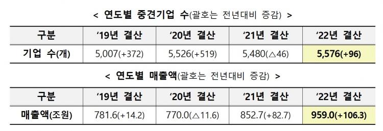 27ÀÏ »ê¾÷Åë»óÀÚ¿øºÎ°¡ ¹ßÇ¥ÇÑ ¡®2022³â Áß°ß±â¾÷ ±âº»Åë°è¡¯¿¡ µû¸£¸é ±¹³» Áß°ß±â¾÷ ¼ö´Â ÃÑ 5576°³·Î ¿ª´ë ÃÖ´ë ¼öÄ¡·Î Áý°èµÆ´Ù. 432°³ ±â¾÷ÀÌ ´ë±â¾÷À¸·Î ¼ºÀåÇϰí 528°³ ±â¾÷ÀÌ Áß°ß±â¾÷À¸·Î ÁøÀÔÇÏ¸é¼ Àü³â ´ëºñ 96°³»ç°¡ ¼øÁõÇß´Ù.