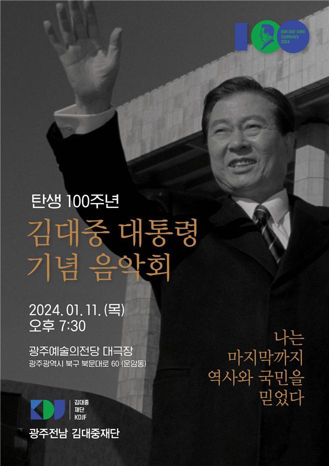 ±¤ÁÖÀü³²±è´ëÁßÀç´ÜÀº ±è´ëÁß Åº»ý 100Áֳ⠱â³ä À½¾Çȸ¸¦ ¿À´Â 11ÀÏ ¿ÀÈÄ 7½Ã 30ºÐ ±¤ÁÖ¿¹¼úÀÇ Àü´ç ´ë±ØÀå¿¡¼ ¿¬´Ù°í 3ÀÏ ¹àÇû´Ù.