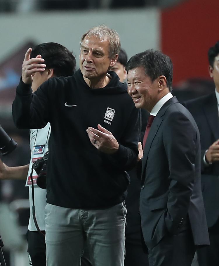 ´ëÇѹα¹ Ã౸ ±¹°¡´ëÇ¥ÆÀ °¨µ¶ ¼±ÀÓ °úÁ¤À» ³õ°í Á¤¸ù±Ô ´ëÇÑÃ౸ÇùȸÀå°ú Ŭ¸°½º¸¸(µ¶ÀÏ) Àü Ã౸´ëÇ¥ÆÀ °¨µ¶ÀÌ ¼·Î ´Ù¸¥ À̾߱⸦ Çϰí ÀÖ´Ù.
