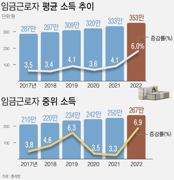 2022³â 12¿ù ±âÁØ ÀÓ±Ý ±Ù·Î ÀÏÀÚ¸®¿¡¼ ÀÏÇÑ ±Ù·ÎÀÚÀÇ Æò±Õ ¼ÒµæÀº 353¸¸¿øÀ¸·Î Àü³âº¸´Ù 6.0%(20¸¸¿ø) ´Ã¾ú´Ù.