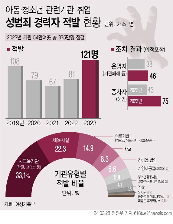 ¿©¼º°¡Á·ºÎ´Â 2023³â Áß¾ÓÇàÁ¤±â°ü, ÁöÀÚü, ±³À°Ã»À» ÅëÇØ Çб³, Çпø°ú üÀ°½Ã¼³ µî ¾Æµ¿¡¤Ã»¼Ò³âÀÌ ÁÖ·Î ÀÌ¿ëÇÏ´Â ±â°üÀ» ´ë»óÀ¸·Î ¼º¹üÁËÀÚ °æ·ÂÀÚ Ãë¾÷ ¿©ºÎ¸¦ Á¡°ËÇÑ °á°ú, Ãë¾÷Á¦ÇÑ´ë»óÀÚ 121¸íÀ» Àû¹ßÇß´Ù°í 28ÀÏ ¹àÇû´Ù.