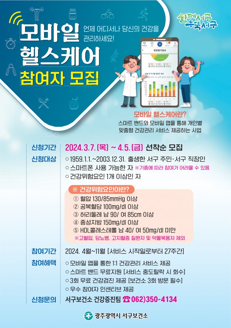 ±¤ÁÖ±¤¿ª½Ã ¼±¸(±¸Ã»Àå ±èÀ̰)´Â Áö¿ªÁÖ¹ÎÀÇ °Ç°¼öÁØ Çâ»óÀ» À§ÇØ ICT ±â¼úÀ» Ȱ¿ëÇÑ °Ç°°ü¸®¼ºñ½º ¡®¸ð¹ÙÀÏ ÇコÄÉ¾î »ç¾÷¡¯´ë»óÀÚ¸¦ ³»´Þ 5ÀϱîÁö ¼±Âø¼ø 170¸í ¸ðÁýÇÑ´Ù.