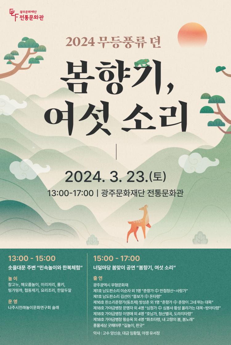 ±¤ÁÖ¹®ÈÀç´Ü ÀüÅ빮Ȱü¿¡¼ ¿¸®´Â ¹«µîdz·ù µ¯ 3¿ù Çà»ç <º½Çâ±â, ¿©¼¸ ¼Ò¸®>ÀÇ ¸ðµç üÇè°ú °ø¿¬Àº ¹«·áÀÌ¸ç ±¤ÁֽùΠ´©±¸³ª Âü¿© °¡´ÉÇÏ´Ù. ÀÚ¼¼ÇÑ »çÇ×Àº ÀüÅ빮Ȱü ȨÆäÀÌÁö¿Í SNS¸¦ ÅëÇØ È®ÀÎ °¡´ÉÇÏ´Ù.