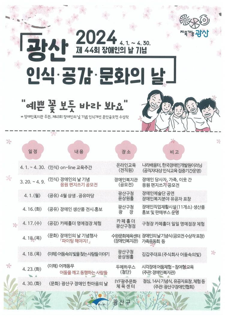 ±¤ÁÖ ±¤»ê±¸(±¸Ã»Àå ¹Úº´±Ô)°¡ 4¿ù 20ÀÏ Á¦44ȸ Àå¾ÖÀÎÀÇ ³¯À» ¸Â¾Æ 4¿ù ÇÑ ´Þ°£ Àå¾Ö Àνݳ¼±, Àå¾ÖÀΰú ºñÀå¾ÖÀÎÀÇ ±³·ù¿Í °ø°¨ È®»êÀ» À§ÇØ ´Ùä·Î¿î Çà»ç¸¦ ÁøÇàÇÑ´Ù.