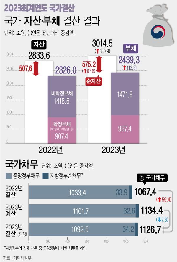 Áß¾ÓÁ¤ºÎ¿Í Áö¹æÁ¤ºÎ°¡ ¹Ýµå½Ã °±¾Æ¾ß ÇÏ´Â ³ª¶ùºúÀÎ ±¹°¡Ã¤¹«(D1)´Â 1126Á¶7000¾ï¿øÀ¸·Î 2022³â 1000Á¶¿øÀ» ³Ñ¾î¼± µ¥ À̾î Áö³ÇØ¿¡´Â 1³â Àü(1067Á¶4000¾ï¿ø)º¸´Ù 59Á¶4000¾ï¿ø ´Ã¾î 1100Á¶¿øÀ» µ¹ÆÄÇß´Ù.