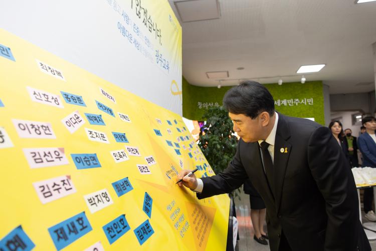Á÷¿øµéÀº 1Ãþ Çö°ü¿¡ ¸¶·ÃµÈ ¡®¾ÈÀüÇÑ ±¤ÁÖ±³À°, ÇູÇÑ »çȸ ¸¸µé±â ½Çõ ´ÙÁü ¼±¾ð¹®¡¯¿¡ 304¸í Èñ»ýÀÚ À̸§À» ÇÑ ¸í ÇÑ ¸í ºÙÀ̸ç, ´õ ¾ÈÀüÇÑ »çȸ¸¦ ¸¸µé°Ú´Ù°í ´ÙÁüÇß´Ù.