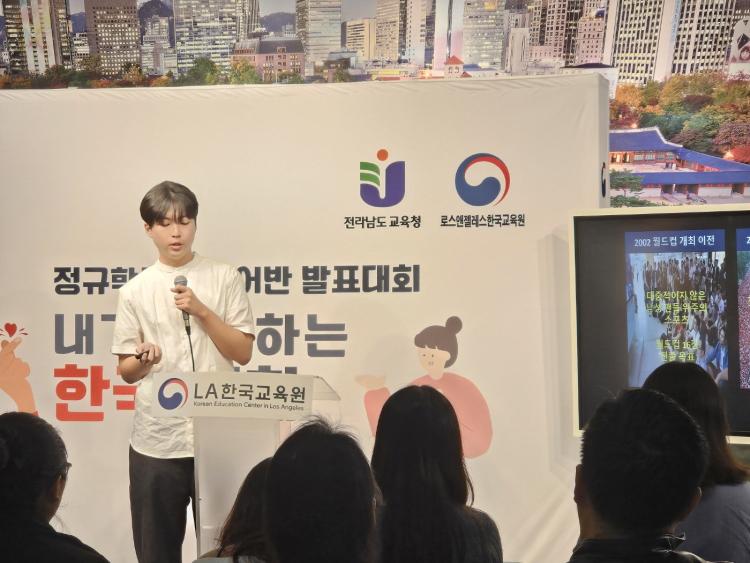 K-POP‧ÇѱÛ‧ÇѺ¹ µî Çѱ¹¹®È¸¦ ¾Ë¸®´Â ÇлýµéÀÇ ¹ßÇ¥´ëȸ°¡ ·Î½º¿£Á©·¹½º ÇöÁö¿¡¼ ¿·Á Å« °ü½ÉÀ» ²ø¾ú´Ù. ¼¼°è °¢±¹ ÇлýµéÀÇ Å« »ç¶ûÀ» ¹Þ°í ÀÖ´Â Çѱ¹¾î±³À° ¼º°ú¿Í Àü³²±³À°Ã»‐¹Ì±¹ °£ ±¹Á¦±³À° ±³·ù¸¦ È®´ëÇÏ´Â ±âȸ¿©¼ ÁÖ¸ñµÈ´Ù.