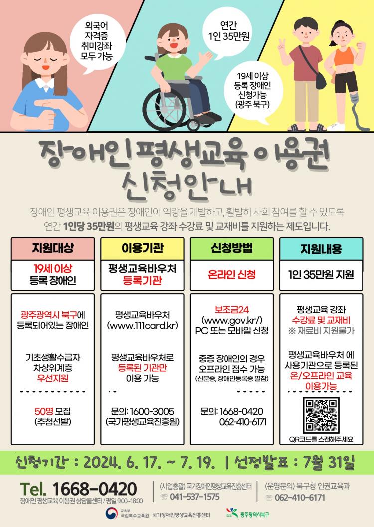 °ø¸ð ¼±Á¤¿¡ µû¶ó ºÏ±¸´Â 19¼¼ ÀÌ»ó µî·Ï Àå¾ÖÀÎ 50¸í¿¡°Ô Æò»ý±³À° °Á ¼ö°·á ¹× ±³Àçºñ·Î ¾µ ¼ö ÀÖ´Â Æò»ý±³À° ¹Ù¿ìó¸¦ 1ÀÎ´ç ¿¬°£ ÃÖ´ë 35¸¸ ¿ø±îÁö Áö¿øÇÒ °èȹÀÌ´Ù.