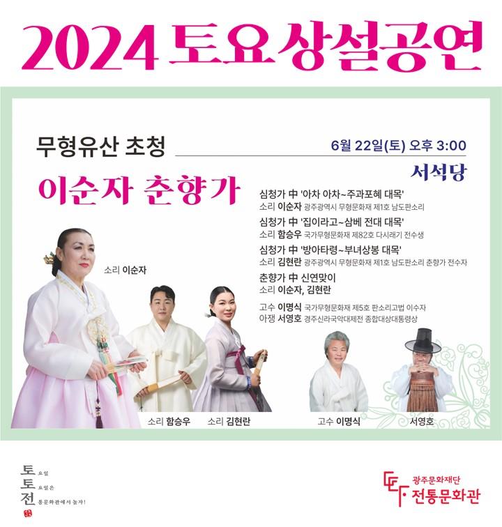 À̳¯ °ø¿¬¿¡¼ À̼øÀÚ ¸íâÀº ÆÇ¼Ò¸® ½Éû°¡ Áß ¾ÆÂ÷¾ÆÂ÷ ´ë¸ñºÎÅÍ ÁÖ°úÇ¥Çý ´ë¸ñ±îÁö ÀüÅëÀÇ ¸Ú°ú ÈïÀÌ ¹è¾îÀÖ´Â °íǰ°ÝÀÇ ±ä¼Ò¸®¸¦ °ü¶÷°´µé¿¡°Ô ¼±»çÇÏ¸ç ¸íâÀÇ Á¦ÀÚµéÀÎ ±¹°¡¹«ÇüÀ¯»ê Á¦82È£ ´Ù½Ã·¡±â Àü¼ö»ý ÇԽ¿쾾°¡ ½Éû°¡ Áß ÁýÀ̶ó°í ´ë¸ñºÎÅÍ »ïº£ Àü´ë ´ë¸ñ±îÁö, ±¤ÁÖ±¤¿ª½Ã ¹«ÇüÀ¯»ê Á¦1È£ ³²µµÆÇ¼Ò¸® ÃáÇâ°¡ Àü¼öÀÚ ±èÇö¶õ¾¾°¡ ½Éû°¡ Áß ¹æ¾ÆÅ¸·É ´ë¸ñºÎÅÍ ºÎ³à»óºÀ ´ë¸ñ±îÁö ÀåÁßÇÏ°í ¼ºÀ½ÀÌ ±í°í ±¸¼öÇÑ Ã¢¹ýÀ» ÆîÄ¡¸ç ÇÑÀ» Ç®¾î³»´Â µíÇÑ ´À³¦ÀÇ ¼Ò¸®µé·Î °ü°´µéÀ» ¸Å·á½Ãų °ÍÀ¸·Î ±â´ëµÈ´Ù.