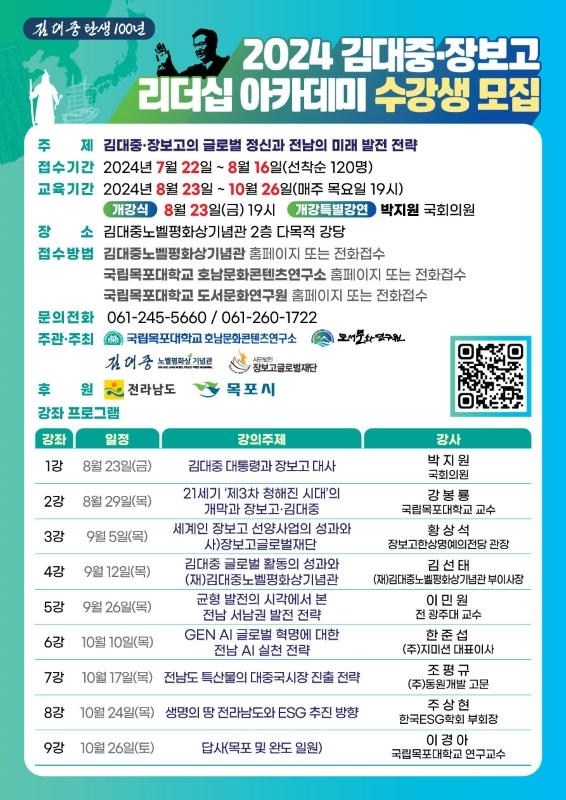 ¸ñÆ÷´ëÇб³ È£³²¹®ÈÄÜÅÙÃ÷¿¬±¸¼Ò´Â ±è´ëÁß Åº»ý 100³âÀ» ¸Â¾Æ ¡®±è´ëÁß¡¤À庸°í ±Û·Î¹ú Á¤½Å°ú Àü³²ÀÇ ¹Ì·¡ ¹ßÀü Àü·«¡¯À̶õ ÁÖÁ¦·Î ¡®2024 ±è´ëÁß¡¤À庸°í ¸®´õ½Ê ¾ÆÄ«µ¥¹Ì¡¯¸¦ °³ÃÖÇÑ´Ù°í 18ÀÏ ¹àÇû´Ù.