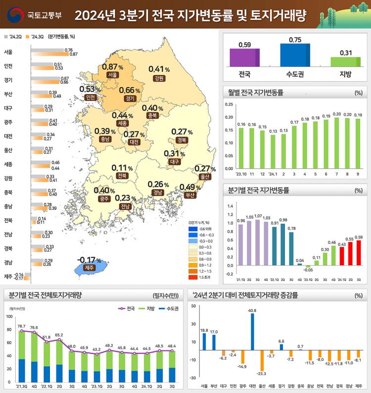 ±¹Åä±³ÅëºÎ¿Í Çѱ¹ºÎµ¿»ê¿øÀÌ 24ÀÏ ¹ßÇ¥ÇÑ 3ºÐ±â Áö°¡º¯µ¿·ü°ú ÅäÁö°Å·¡·® ÀÚ·á¿¡ µû¸£¸é ¿Ã 3ºÐ±â Àü±¹ Áö°¡´Â 0.59% »ó½ÂÇß´Ù. Áö³ 2ºÐ±â(0.55)º¸´Ù´Â 0.04%p, Áö³ÇØ µ¿±â(0.3%)º¸´Ù´Â 0.29%p ¿Ã¶ú´Ù.