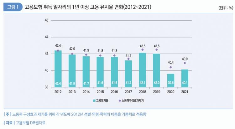 ¼ºº°·Î º¸¸é 2021³â ±âÁØ ³²¼ºÀÇ 1³â ÀÌ»ó °í¿ëÀ¯ÁöÀ²Àº 42.4%, ¿©¼ºÀÇ °í¿ëÀ¯ÁöÀ²Àº 37.9%¿´´Ù.