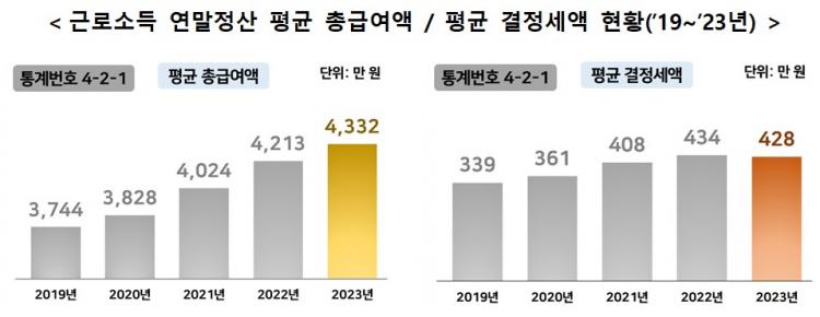 Æò±Õ Ãѱ޿©¾×Àº Àü³â(4213¸¸¿ø) ´ëºñ 2.8%(119¸¸¿ø) ´Ã¾î³ 4332¸¸¿øÀ¸·Î ÃÖ±Ù 5³â°£ Áö¼ÓÀû Áõ°¡ Ãß¼¼´Ù. Æò±Õ °áÁ¤¼¼¾×Àº 428¸¸¿øÀ¸·Î ¼Òµæ¼¼ °ú¼¼Ç¥ÁØ ±¸°£ Á¶Á¤À¸·Î Àü³âµµ 434¸¸¿øº¸´Ù 1.4%(6¸¸¿ø) °¨¼ÒÇß´Ù.