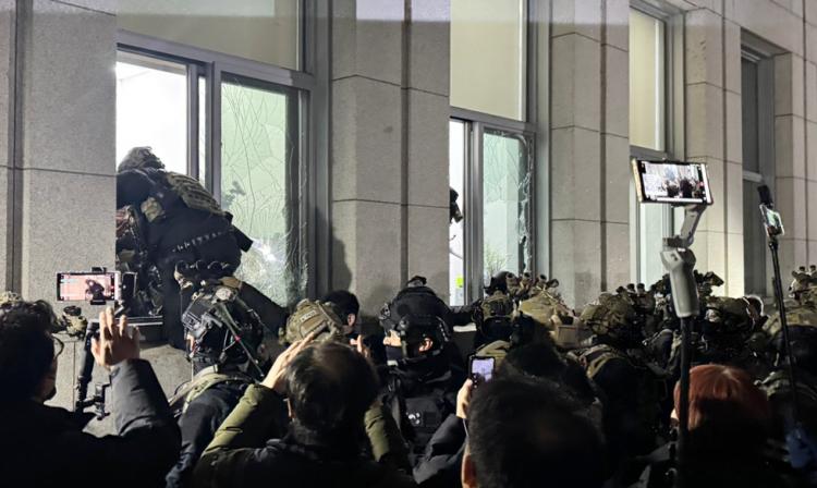 12¡¤3 ºñ»ó°è¾ö ´ç½Ã ±¹È¸¿¡ ÅõÀÔµÈ À°±º Ư¼öÀü»ç·ÉºÎ 707Ư¼öÀÓ¹«´ÜÀÌ ÇöÀåÀ» ÃëÀçÇÏ´ø ±âÀÚ¸¦ Áý´ÜÀ¸·Î ÆøÇàÇϰí ÄÉÀ̺íŸÀÌ·Î Æ÷¹ÚÇÏ·Á´ø Á¤È²ÀÌ ±¹È¸ Æóȳȸ·Î(CC)TV¿¡ ´ã°å´Ù.