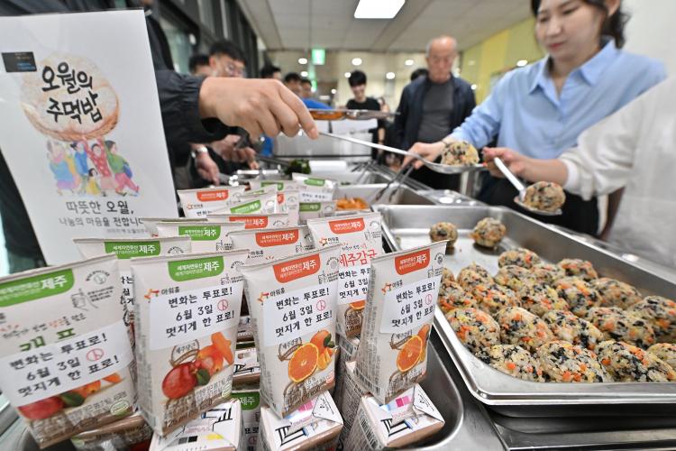 ¼±¸´Â À̳¯ Á¡½É½Ã°£¿¡ ±¸³»½Ä´çÀ» ãÀº Á÷¿øµéÀ» À§ÇØ ÃÑ 350ÀκÐÀÇ ¡®5¡¤18ÁָԹ䡯À» ÁغñÇß´Ù. ¿©±â¿¡ ¡°º¯È´Â ÅõÇ¥·Î! 6¿ù3ÀÏ ¸ÚÁö°Ô ÇÑ Ç¥·Î¡±¶ó´Â ¹®±¸°¡ »õ°ÜÁø À½·á¸¦ ÇÔ²² Á¦°øÇϸç ÅõÇ¥ µ¶·Á ¸Þ½ÃÁö¸¦ ÀüÇß´Ù.