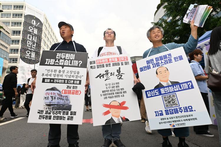 5¡¤18¹ÎÁÖȿ 45Áֱ⸦ ÇÏ·ç ¾ÕµÐ 17ÀÏ ¿ÀÈÄ ±¤ÁÖ µ¿±¸ ±Ý³²·Î. 5¡¤18¹ÎÁßÇ×Àï±â³äÇà»çÀ§ÀÇ ¿À¿ù½Ã¹Î³Àå¿¡ Âü¿©ÇÑ °æ³² ÇÕõ±º¹ÎµéÀº ¸ñ¿¡ Çʹ븦 ¼¼¿ì¸é¼ ¡°ÀüµÎȯ °ø¿øÀÇ À̸§À» ¹Ù²ã¾ß ÇÑ´Ù¡±°í ¸ñ¼Ò¸®¸¦ ³ô¿´´Ù.