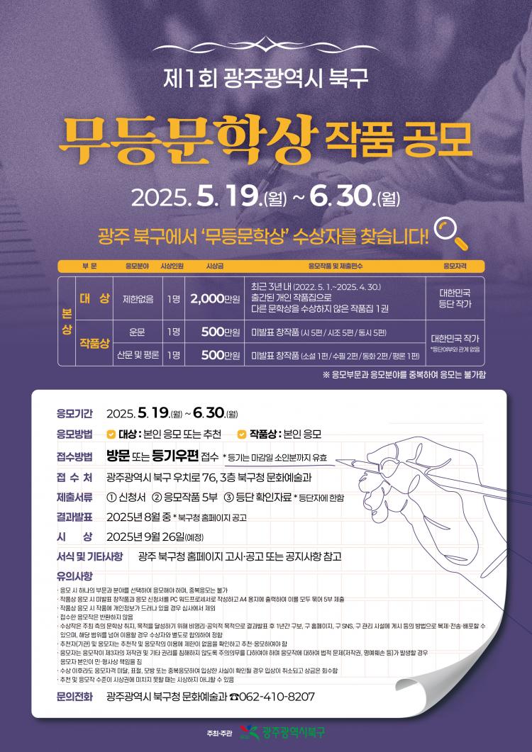 ÀÛǰ Á¢¼ö´Â ¹æ¹® ¶Ç´Â µî±â¿ìÆíÀ¸·Î °¡´ÉÇϸç Á¦Ãâ¼·ù ¹× À¯ÀÇ»çÇ× µî ±âŸ ÀÚ¼¼ÇÑ ³»¿ëÀº ºÏ±¸Ã» ´©¸®Áý¿¡ °Ô½ÃµÈ °ø°í¹®À» Âü°íÇϰųª ºÏ±¸Ã» ¹®È¿¹¼ú°ú(062-410-8207)·Î ¹®ÀÇÇÏ¸é µÈ´Ù.