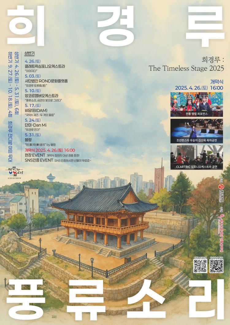 ±¤ÁÖ¹®ÈÀç´Ü(´ëÇ¥ÀÌ»ç ³ëÈñ¿ë) ÀüÅ빮ȰüÀº ¿À´Â 31ÀÏ(Åä) Åä¿ä »ó¼³°ø¿¬(¿ÀÈÄ 3½Ã, 8ȸÂ÷)°ú Èñ°æ·ç dz·ù¼Ò¸®(¿ÀÈÄ 4½Ã, 6ȸÂ÷) ¹«´ë¸¦ ¼±º¸ÀδÙ.