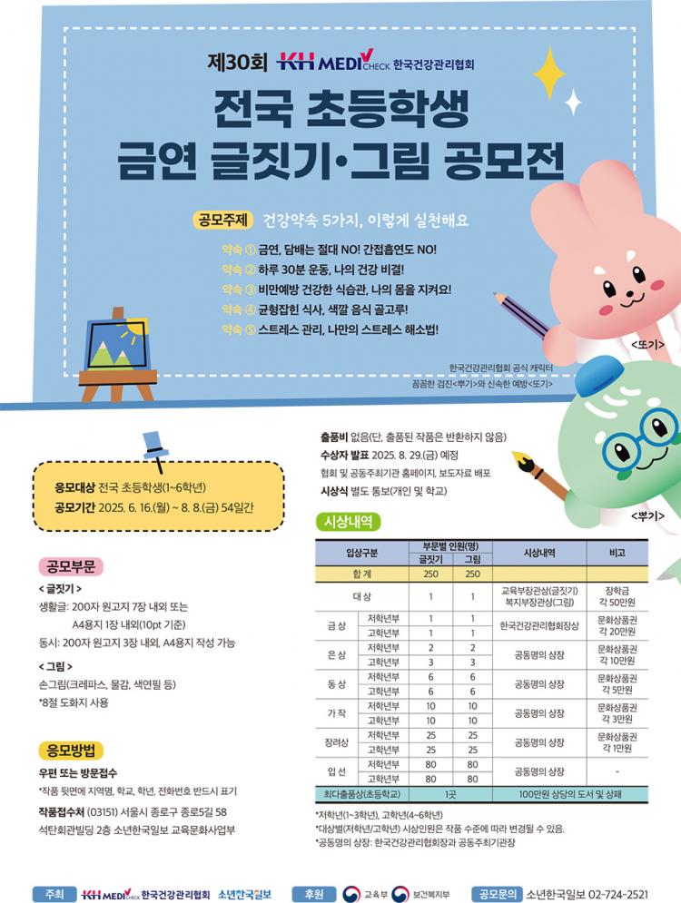 KHÇѱ¹°Ç°°ü¸®Çùȸ(ȸÀå ±èÀοø, ÀÌÇÏ °ÇÇù)´Â ¼Ò³âÇѱ¹ÀϺ¸¿Í ÇÔ²² ±³À°ºÎ¿Í º¸°Çº¹ÁöºÎ°¡ ÈÄ¿øÇÏ´Â ¡®Á¦30ȸ KHÇѱ¹°Ç°°ü¸®Çùȸ Àü±¹ ÃʵîÇлý ±Ý¿¬ ±ÛÁþ±â¡¤±×¸² °ø¸ðÀü¡¯À» °³ÃÖÇÑ´Ù.