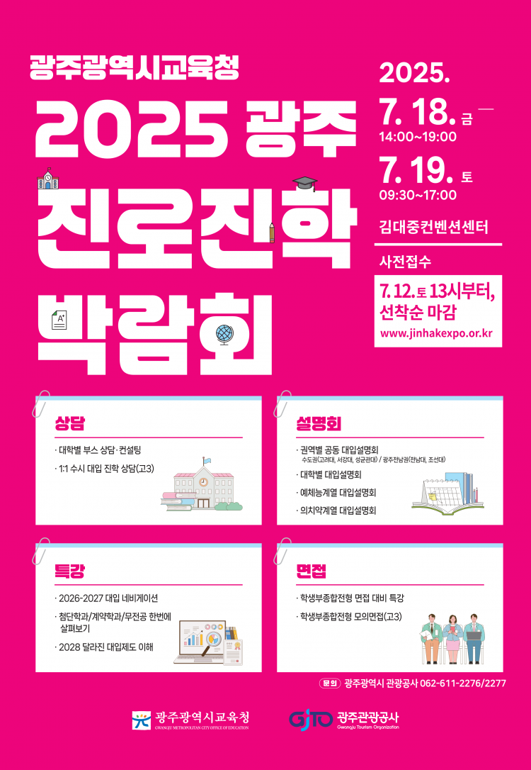 À̹ø ¹Ú¶÷ȸ¿¡¼ 1 ´ë 1 ¼ö½Ã ´ëÀÔ »ó´ã, ´ëÇк° ÀԽü³¸íȸ, ÁÖÁ¦º° Ư° µî¿¡ Âü¿©ÇÏ°í ½ÍÀº ÇлýÀº 12ÀÏ ¿ÀÈÄ 1½ÃºÎÅÍ ±¤ÁÖÁø·ÎÁøÇйڶ÷ȸ ´©¸®Áý(www.jinhakexpo.or.kr)À» ÅëÇØ »çÀü½ÅûÇÏ¸é µÈ´Ù. ´Ü Âü¿©ÀÚ´Â ÇÁ·Î±×·¥º°·Î ¼±Âø¼ø ¸¶°¨µÇ¹Ç·Î, À¯ÀÇÇØ¾ß ÇÑ´Ù.