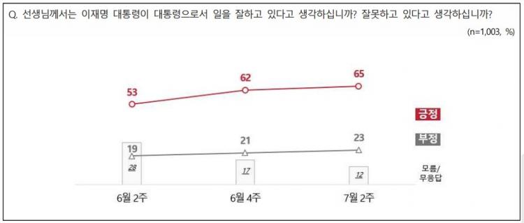 ÀÌÀç¸í ´ëÅë·ÉÀÇ Á÷¹« ¼öÇà¿¡ ´ëÇØ ¡®ÀßÇϰí ÀÖ´Ù¡¯´Â Æò°¡°¡ 65%, ¡®À߸øÇϰí ÀÖ´Ù¡¯´Â Æò°¡°¡ 23%¶ó´Â ¿©·ÐÁ¶»ç °á°ú°¡ 10ÀÏ ³ª¿Ô´Ù.