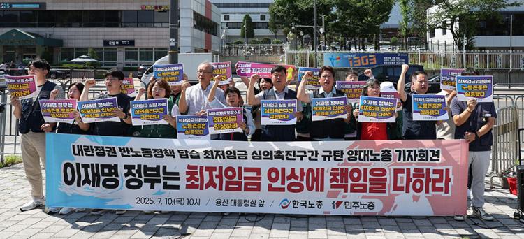 Çѱ¹³ëÃÑ¡¤¹ÎÁÖ³ëÃÑÀÌ 10ÀÏ ¼¿ï ¿ë»ê±¸ ´ëÅë·ÉÁý¹«½Ç ¾Õ¿¡¼ ±âÀÚȸ°ßÀ» ¿°í ÃÖÀúÀÓ±Ý ½ÇÁú Ç϶ô ½ÉÀÇÃËÁø±¸°£À» ±ÔźÇÏ¸ç ½ÇÁú»ý°èºñ º¸Àå¼öÁØÀÇ ÃÖÀúÀÓ±Ý ÀλóÀ» Ã˱¸Çϰí ÀÖ´Ù.