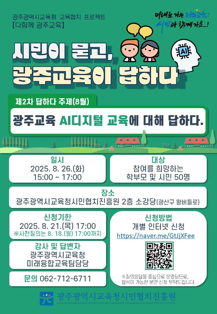 À̹ø Çà»ç´Â ¡®±¤ÁÖ±³À° AI µðÁöÅÐ ±³À°¿¡ ´ëÇØ ´äÇÏ´Ù¡¯¸¦ ÁÖÁ¦·Î ½Ã±³À°Ã» ¹Ì·¡±³À°±âȹ°ú ¹Ì·¡À¶ÇÕ±³À°ÆÀ ÀåÇаü, ÀåÇл簡 µðÁöÅÐ ±³À° °ü·Ã Á¤Ã¥À» ¼³¸íÇÏ°í ½Ã¹ÎµéÀÇ ±Ã±ÝÁõÀ» ÇØ¼ÒÇÑ´Ù.