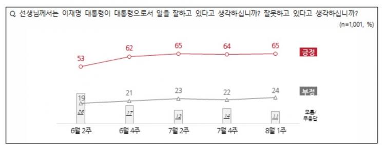 ÀÌÀç¸í ´ëÅë·ÉÀÇ Á÷¹« ¼öÇà¿¡ ´ëÇØ ¡®ÀßÇϰí ÀÖ´Ù¡¯´Â Æò°¡°¡ 65%, ¡®À߸øÇϰí ÀÖ´Ù¡¯´Â Æò°¡°¡ 24%¶ó´Â ¿©·ÐÁ¶»ç °á°ú°¡ 7ÀÏ ³ª¿Ô´Ù.