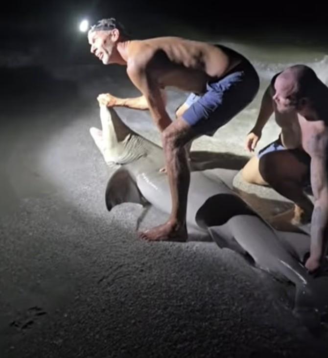 ¹ÂÁî¿Í Ä£±¸µéÀº »çÁøÀ» ³²±â±â À§ÇØ »ó¾î¿¡ ´Ù°¡°¬´Ù. ¹ÂÁî°¡ »ó¾îÀÇ ¸Ó¸®¸¦ µé¾î ¿Ã¸®°í, ´Ù¸¥ Ä£±¸°¡ ²¿¸®¸¦ ºÙÀâ´Â ¼ø°£ »ó¾î°¡ °©Àڱ⠸öÀ» Ʋ¾î ¹ÂÁîÀÇ ´Ù¸®¸¦ ¹°¾ú´Ù.