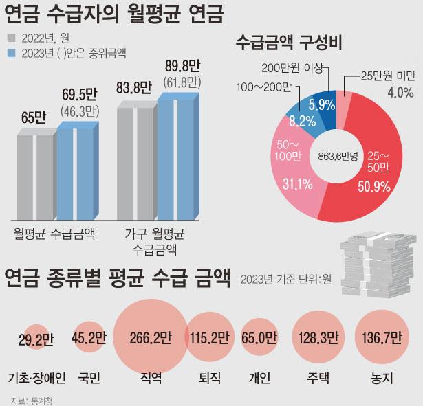 2023³â ¿¬±Ý ¼ö±ÞÀÚ°¡ ¹ÞÀº ¿ùÆò±Õ ¼ö±Þ±Ý¾×Àº 69¸¸5000¿øÀ¸·Î Àü³â´ëºñ 6.9% Áõ°¡Çß´Ù.