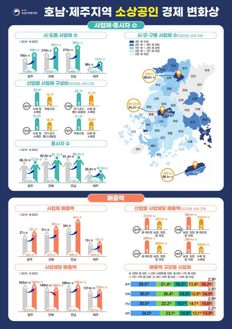2023³â ¼Ò»ó°øÀÎ »ç¾÷ü ¼ö´Â Àü³²(26¸¸3000 °³), ÀüºÏ(26¸¸1000 °³), ±¤ÁÖ(19¸¸4000 °³), Á¦ÁÖ(12¸¸1000 °³) ¼øÀ̾ú´Ù.