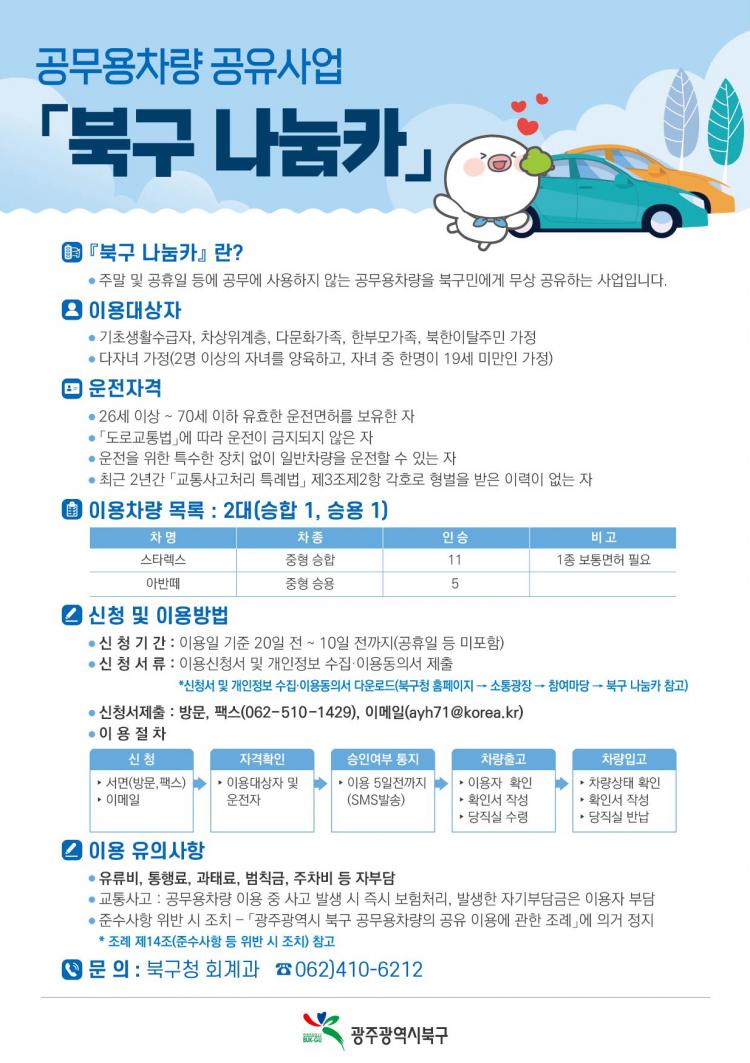 ±¤Áֽà ºÏ±¸(±¸Ã»Àå ¹®ÀÎ)´Â ÁÖ¸» ¹× °øÈÞÀÏ¿¡ ¿îÇàÇÏÁö ¾Ê´Â °ø¹«¿ëÂ÷·®À» Áö¿ª Áֹε鿡°Ô ¹«»óÀ¸·Î °øÀ¯ÇÏ´Â ¡®ºÏ±¸ ³ª´®Ä«¡¯ »ç¾÷À» ½ÃÇàÇÑ´Ù°í 4ÀÏ ¹àÇû´Ù.