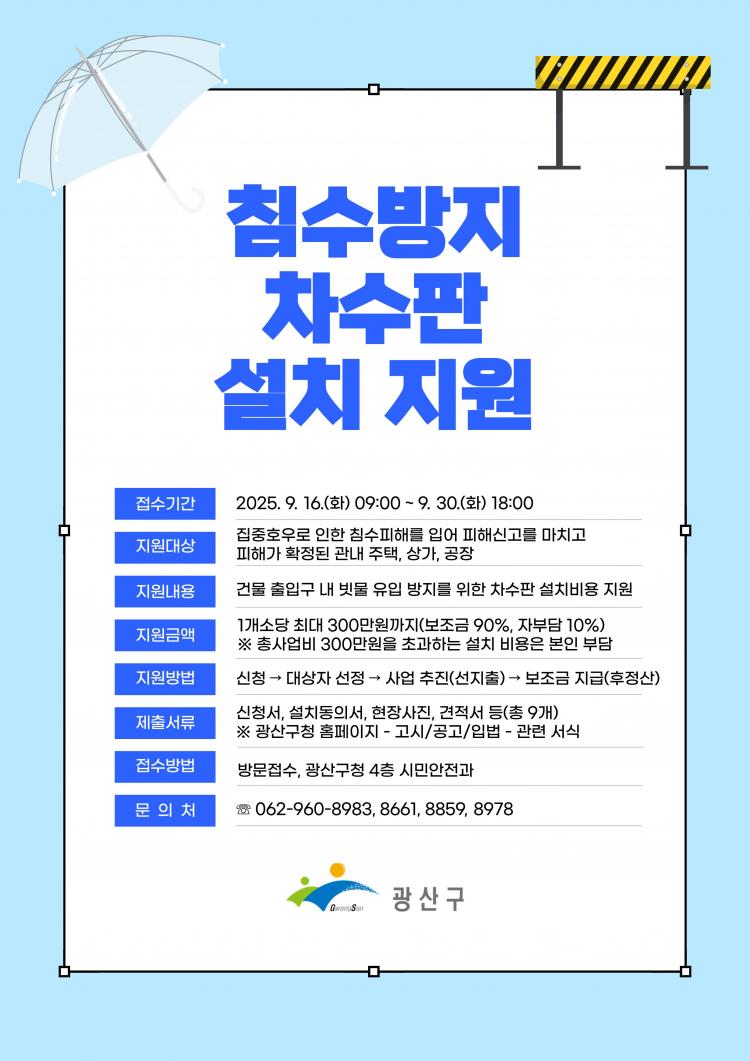 Â÷¼öÆÇ(¹°¸·ÀÌÆÇ) ¼³Ä¡ Áö¿ø»ç¾÷Àº °Ç¹° ÃâÀÔ±¸ ³» ºø¹° À¯ÀÔ Â÷´ÜÀ» À§ÇØ ±¤»ê±¸°¡ Â÷¼öÆÇ(¹°¸·ÀÌÆÇ) ¼³Ä¡ ºñ¿ëÀ» Áö¿øÇÏ´Â »ç¾÷ÀÌ´Ù.