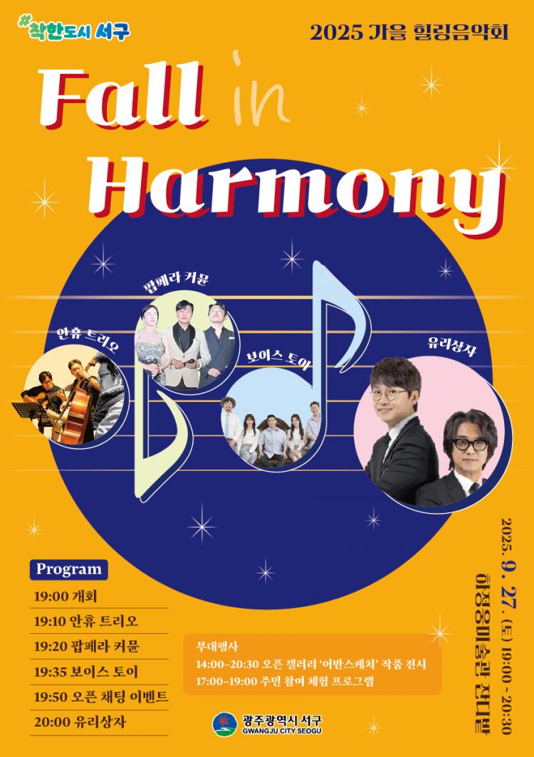 ±¤ÁÖ±¤¿ª½Ã ¼±¸(±¸Ã»Àå ±èÀ̰)´Â ¿À´Â 27ÀÏ ¿ÀÈÄ 7½Ã ³ó¼ºµ¿ ÇÏÁ¤¿õ¹Ì¼ú°ü ¾Õ Àܵð±¤Àå¿¡¼ ¡®2025 °¡À» Èú¸µÀ½¾Çȸ – Æú ÀÎ Çϸð´Ï(Fall in Harmony)¡¯¸¦ °³ÃÖÇÑ´Ù.