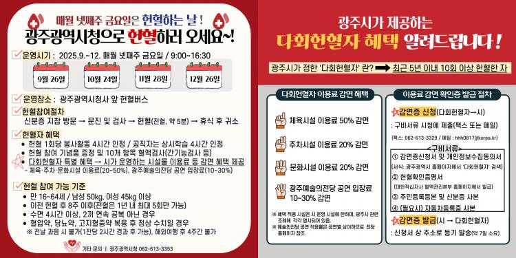 ±¤Áֽô ÇåÇ÷ Ȱ¼ºÈ¸¦ À§ÇØ 12¿ù±îÁö ¸Å¿ù ³Ý° ÁÖ ±Ý¿äÀÏÀ» ¡®ÇåÇ÷ Âü¿©ÀÇ ³¯¡¯·Î Á¤ÇÏ°í ´ëÇÑÀû½ÊÀÚ»ç ±¤ÁÖ¡¤Àü³²Ç÷¾×¿ø°ú Çù·ÂÇØ ¿ÀÀü 9½ÃºÎÅÍ ¿ÀÈÄ 4½Ã30ºÐ±îÁö û»ç ¾Õ ½Ã¹Î±¤Àå¿¡ ÇåÇ÷¹ö½º¸¦ ¹èÄ¡ÇÑ´Ù°í 25ÀÏ ¹àÇû´Ù.