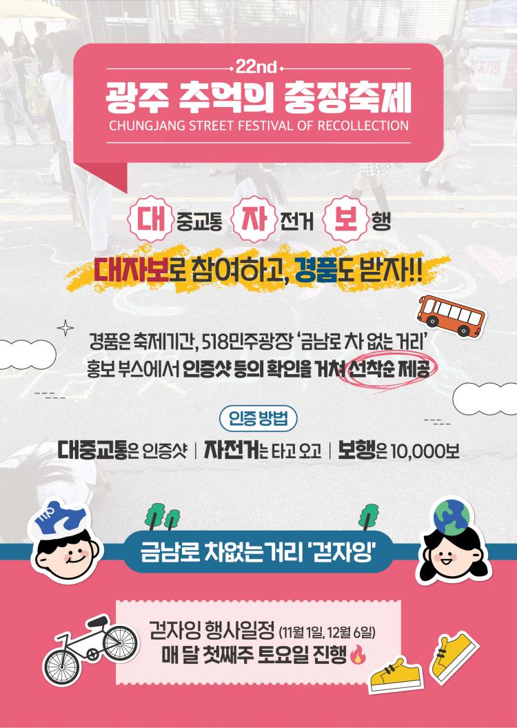 ±¤ÁÖ µ¿±¸(ûÀå ÀÓÅÃ)´Â ¿À´Â 15ÀϺÎÅÍ 5Àϰ£ ±Ý³²·Î¿Í ÃæÀå·Î ÀÏ¿ø¿¡¼ ¿¸®´Â Á¦22ȸ ±¤ÁÖ Ãß¾ïÀÇ ÃæÀåÃàÁ¦¿¡¼ ¡®±Ý³²·Î Â÷ ¾ø´Â °Å¸®¡¯ÀÇ °¡Ä¡¸¦ ¾Ë¸®°í ´ëÀÚº¸ µµ½Ã Á¤Ã¥¿¡ ½Ã¹Î Âü¿©¸¦ È®´ëÇϱâ À§ÇÑ Æ¯º° È«º¸ À̺¥Æ®¸¦ ÁøÇàÇÑ´Ù°í ¹àÇû´Ù.