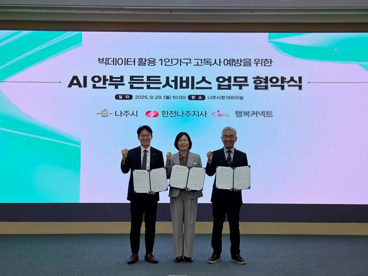 ³ªÁÖ½Ã(½ÃÀå À±º´ÅÂ)´Â ÃÖ±Ù Çѱ¹Àü·Â°ø»ç ³ªÁÖÁö»ç(Áö»çÀå ¼ÛÀç±Ù), SKÀç´Ü¹ýÀÎ ÇູĿ³ØÆ®(ÀÌ»çÀå ¾öÁ¾È¯)¿Í ÇÔ²² 1ÀÎ °¡±¸ »çȸ¾ÈÀü¸Á °È¸¦ À§ÇÑ ¡®AI¾ÈºÎ µçµç¼ºñ½º¡¯ 3ÀÚ ¾÷¹«Çù¾àÀ» ü°áÇÏ¸ç ¹Î°ü°øÀÌ ÇÔ²²ÇÏ´Â ÅëÇÕÇü »çȸ¾ÈÀü¸Á ±¸Ãà¿¡ ³ª¼¹´Ù°í 11ÀÏ ¹àÇû´Ù.