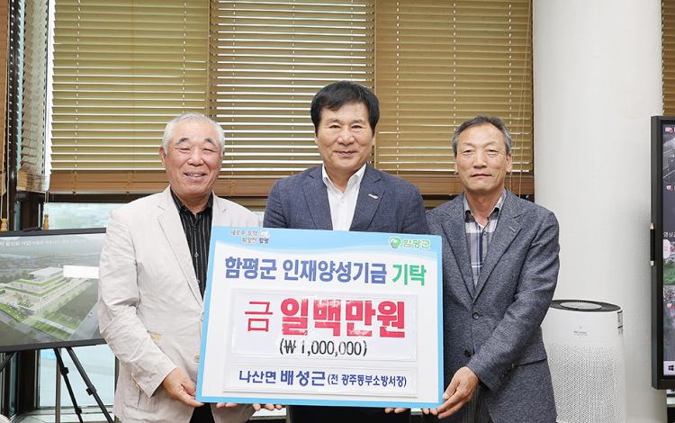 ÇÔÆò±º¿¡¼ ³ª»ê¸é¿¡ °ÅÁÖÇÏ´Â ¹è¼º±Ù(69¼¼) ¾¾°¡ ÇÔÆò±º Áö¿ªÀÎÀç ¾ç¼ºÀ» À§ÇØ ÀåÇбÝÀ» ±âÅ¹ÇØ Áö¿ª»çȸÀÇ ±Í°¨ÀÌ µÇ°í ÀÖ´Ù.