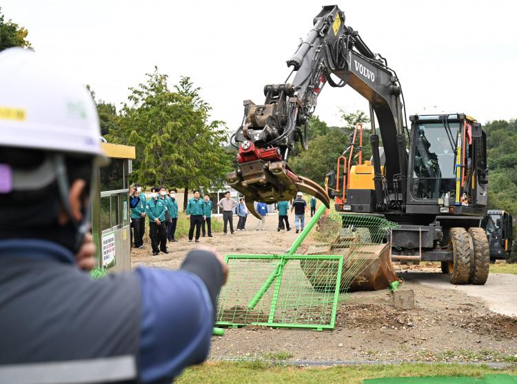 ÆÄÅ©°ñÇÁÀå ÀÔ±¸¿¡ ¼³Ä¡µÈ 10¿©mÀÇ Ã¶Á¦ Ææ½º´Â ±¼Âø±â°¡ ¸î Â÷·Ê ¹Ù±¸´Ï(¹öŶ) ´Þ¸° ÆÈÀ» ÈÖÁ£ÀÚ Èû¾øÀÌ ¹«³ÊÁ³´Ù. ±¼Âø±â´Â öÁ¦ Ææ½º¸¦ ö°ÅÇÑ µÚ °ðÀå ÆÄÅ©°ñÇÁÀå Àܵð Çʵå·Î ÁøÀÔÇß´Ù.