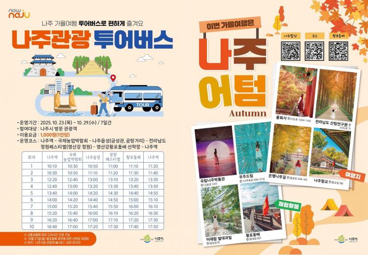 ¿îÇà ÄÚ½º´Â ³ªÁÖ¿ª(¼Û¿ùµ¿)À» Ãâ¹ßÇØ ¡®2025±¹Á¦³ó¾÷¹Ú¶÷ȸ¡¯°¡ ¿¸®´Â Àü¶ó³²µµ³ó¾÷±â¼ú¿ø(»êÆ÷¸é)-³ªÁÖÀ¾¼º(±Ý³²µ¿)-¡®2025 Àü¶ó³²µµ Á¤¿øÆä½ºÆ¼¹ú¡¯ÀÌ ¿¸®°í ÀÖ´Â ¿µ»ê°Á¤¿ø(¿µ»êµ¿)-ȲÆ÷µÀ¹è ¼±ÂøÀå(ÀÌ⵿)À» °æÀ¯ÇÑ µÚ, ´Ù½Ã ³ªÁÖ¿ªÀ¸·Î µ¹¾Æ¿À´Â ¼øÈ¯ ³ë¼±ÀÌ´Ù.