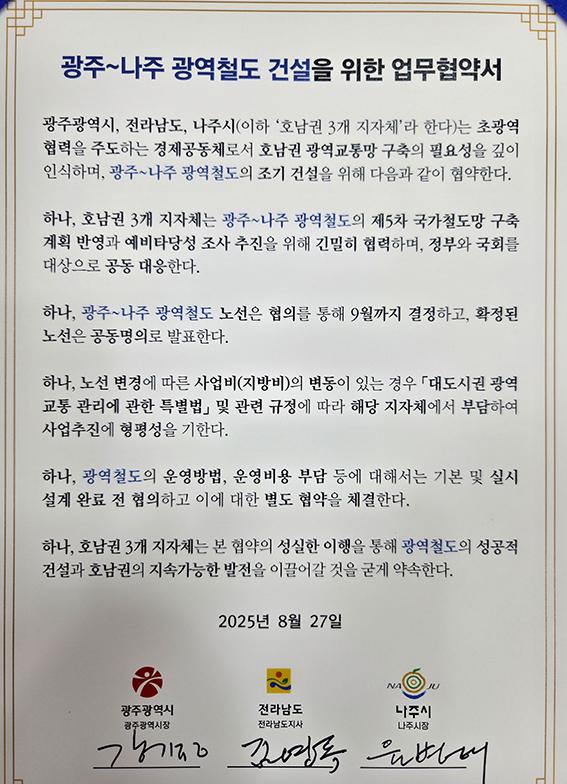 Àü³²µµ¿Í ±¤ÁֽᤳªÁֽô ÀÌ´Þ ¸» ¶Ç´Â ³»´Þ ÃÊ Áß ±¤ÁÖ¡³ªÁÖ ±¤¿ªÃ¶µµ °Ç¼³À» À§ÇÑ ÇÕÀǹ®À» °øµ¿¹ßÇ¥Çϱâ·Î Çß´Ù. ¶Ç Á¦5Â÷ ±¹°¡Ã¶µµ¸Á ±¸Ãà°èȹ¿¡ ¹Ý¿µµÉ ¼ö ÀÖµµ·Ï °øµ¿ ³ë·ÂÀ» ±â¿ïÀ̱â·Î Çß´Ù.