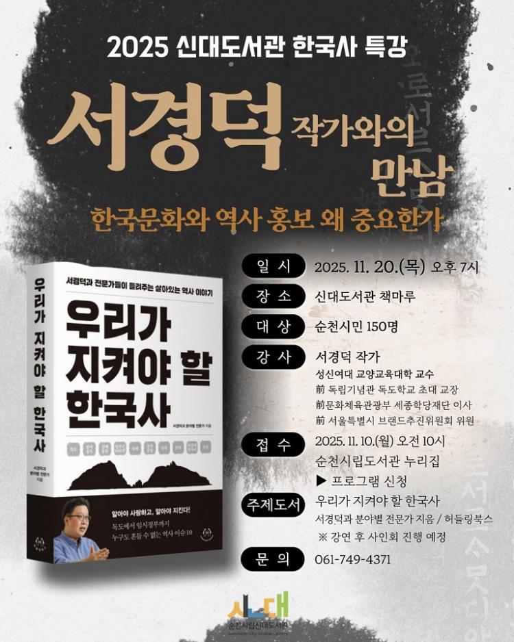 ¼øÃµ½Ã(½ÃÀå ³ë°ü±Ô)´Â ¿À´Â 20ÀÏ(¸ñ) ¿ÀÈÄ 7½Ã, ¼øÃµ½Ã¸³½Å´ëµµ¼°ü Ã¥¸¶·ç¿¡¼ ¼°æ´ö ¼º½Å¿©ÀÚ´ëÇб³ ±³¼ö¸¦ ÃÊÃ»ÇØ ¡®Çѱ¹ ¹®È¿Í ¿ª»ç È«º¸, ¿Ö Áß¿äÇѰ¡¡¯¸¦ ÁÖÁ¦·Î °¿¬À» °³ÃÖÇÑ´Ù.